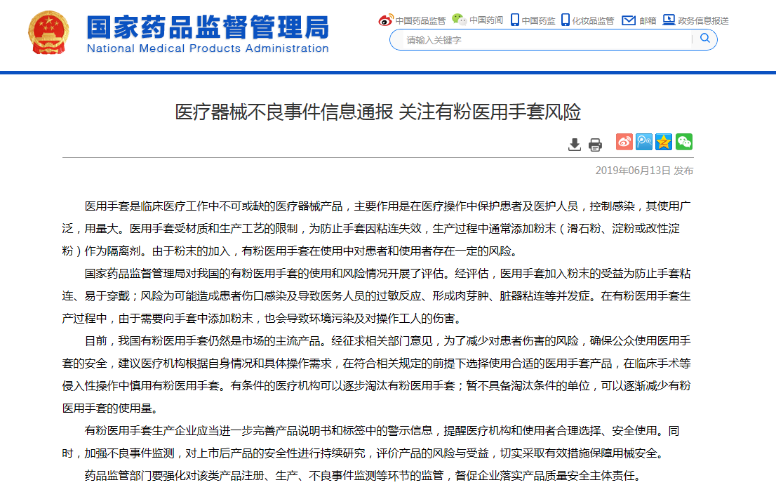 國(guó)家藥監(jiān)局發(fā)布醫(yī)療器械不良事件信息通報(bào),提示關(guān)注有粉醫(yī)用手套風(fēng)險(xiǎn),建議醫(yī)療機(jī)構(gòu)在臨床手術(shù)等侵入性操作中慎用有粉醫(yī)用手套。