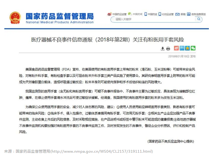早在2016年,美國食品藥品監(jiān)督管理局(FDA)宣布,在美國使用的有粉醫(yī)用手套上帶有的粉末(滑石粉、玉米淀粉等)可能帶來安全風(fēng)險(xiǎn),對(duì)有粉外科手套、有粉檢查手套以及可吸收粉末外科手套三類產(chǎn)品實(shí)施了使用禁令。其研究表明醫(yī)用手套上附帶的粉末可能成為天然橡膠蛋白載體,造成呼吸道過敏反應(yīng);粉末本身則可能使肉芽腫和手術(shù)后組織粘連的風(fēng)險(xiǎn)增大。