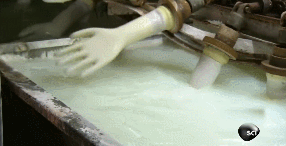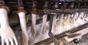 經(jīng)過前面一系列處理后,手套模型終于要浸過液體橡膠了。橡膠與之前殘留在模型上的化學(xué)試劑發(fā)生反應(yīng),形成膠狀的合成橡膠。穿戴由這種合成橡膠制成的手套還可以防止對(duì)自然橡膠的過敏。