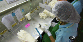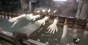 再經(jīng)過漂白水消毒。每個(gè)手套模型都必須清洗干凈,因?yàn)槟呐率且稽c(diǎn)點(diǎn)的小雜質(zhì),都會(huì)殘留在橡膠手套中,甚至導(dǎo)致手套破洞。