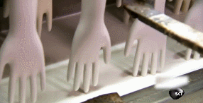 作為橡膠制品的橡膠手套的制作過程簡直不能太魔性,手套的模型是陶瓷或者鋁制成的。前方高能多圖,請(qǐng)大家預(yù)備好流量。