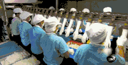 玉米淀粉會(huì)被當(dāng)做潤滑粉附著到手套上,一是防止手套粘黏在盒子里,二是方便以后的穿戴。之后每100個(gè)手套會(huì)被工人裝到盒子里,大概一個(gè)工廠每小時(shí)可以生產(chǎn)1萬2前個(gè)手套。
